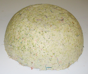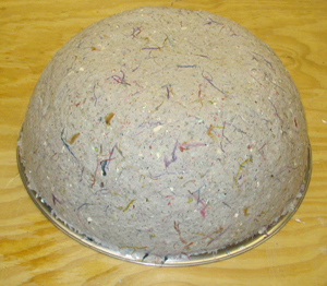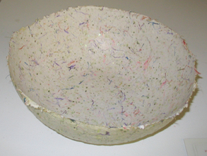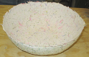 This is what the bowl looks like fresh off the mould. I made this one with old bank statements, old credit card statements, and old utility bills. I also shredded some multicolor flower petals, which shredded into the threads you see in the paper, and added some irridescent confetti for some shine. | ||||||||