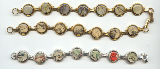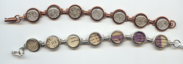 ![]() I make bracelets with the many kinds of vintage paper. Some are printed; some are handwritten; some are typed. I do not use photocopies of vintage paper; I use the real thing. I also use vintage watch parts in some of my work. Sometimes I use vintage drawings, vintage postmarks and stamps, or the images on vintage greeting cards or postcards. I offer bracelets in silver, gold or copper, and the cups are round, small round, or rectangular. |