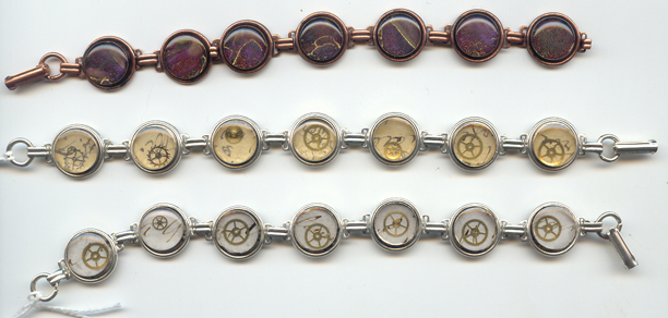 | These are good examples of the elements I use most frequently in my jewelry. All of the jewelry pictured here has been sold. Bracelets are $30 plus shipping. | |||||||||