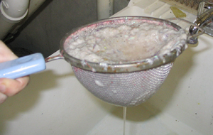 So, you've made a bunch of paper, and now you've got a Rubbermaid bin of leftover paper pulp floating in water. What do you do with it? Well, you can water a tree or a garden with it; the pulp will sit on the surface of the soil for a bit, but it will dissolve eventually. Or you can filter off the pulp by pouring it through an old nylon, or through a strainer, and let the water go down the sink or the toilet. Please don't dump the pulp directly into your plumbing system; you will definitely clog your pipes over time. Paper pulp is sticky, and it does cling to surfaces. |