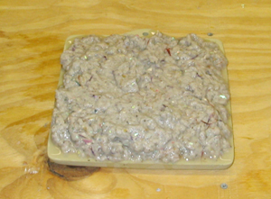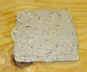 Stand over a sink. Hold the mould in one hand, and with a sponge, gently press the pulp into the mould and get the water out of there. Wring out your sponge as necessary. This photo shows the mould after all the sponging is done. | ||||||||