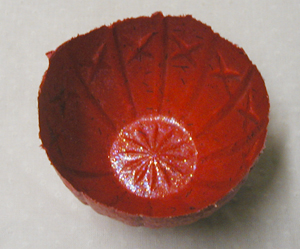 This is a tiny bowl, about the size of a teacup. It is very hard to make because of the X's around the rim. Separating the bowl from the mold after it dries is tricky, and I seem to destroy more than I make. But it's very rewarding to make one that works; the patterning visible on the inside is beautiful. Plain colors work best on this mold so that the patterning shows up clearly. | ||||||||