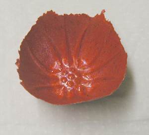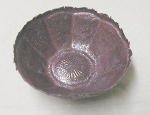 This is a tiny bowl, about the size of a teacup. It has lovely deep fluting and an interesting dotted pattern on the base. The outside has only a hint of the fluting; it is mostly visible from the inside. | ||||||||