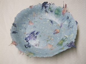 This is a very large bowl. It was made on a glass pie plate, so it's the size of a standard bakery pie. I made this one with multicolored angel wing flowers added to the pulp. | ||||||||