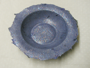This bowl is about 6" from brim to brim, and about 2" deep. This particular example is purple on the inside, and black on the outside, with a sparkle finish. The sparkle finish works very well on these dark colors. I love it on black! | ||||||||