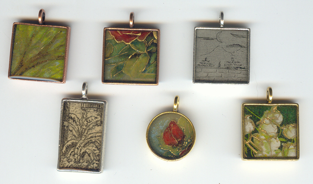 ![]() These pendants were made with vintage postcard images and vintage greeting cards. The one in the top right corner was a vintage drawing. I've also made pendants with antique photos, newspaper, and will try some experiments soon with fabric! |