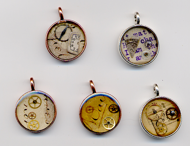 ![]() These pendants were made with vintage paper of various kinds: sheet music, typed paper, and handwritten paper. The metal pieces are watch gears and other watch parts. The paper is carefully cut to fit the jewelry cup, and sealed in two-part epoxy to create a durable, transparent finish. I use both gold, silver and copper for the jewelry, and in addition to the round design here, I also made pendants in squares, ovals and rectangle shapes (the vertical axis is the long axis). Pendants are sold with 16" or 18" rubber cords with sterling clasps; the cords are either black or gunmetal. The gunmetal looks best with silver pendants, and black with copper or gold. |